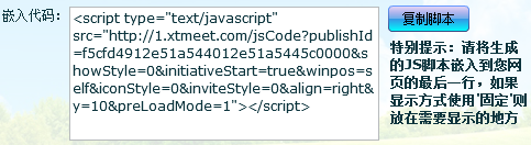 进入网页即可交流:当有访客进入网页时,不管有没有打开聊天窗口,均会显示在客服端软件的客户一栏中,客服可向其发送消息,访客收到消息时自动弹出聊天窗口显示消息。 打开聊天窗口时交流:与上一模式相反,访客进入网页时不会显示在客服的客户一栏中,只有访客打开聊天窗口时才会显示在客服端软件中。对于访客量非常大的网站,比较适合此模式,因为所有访客都显示在客服的界面中,将是很长的列表,处理起来非常费力。 以上所有选顶的操作都会立即反应到生成的代码中,把此文本框中的文本复制下来,嵌入到网页中就可以完成了。理论上代码放在网页中 之后都会正常生效,但为了不影响网页本身内容的加载速度,建议尽量放到网页内容的后面。